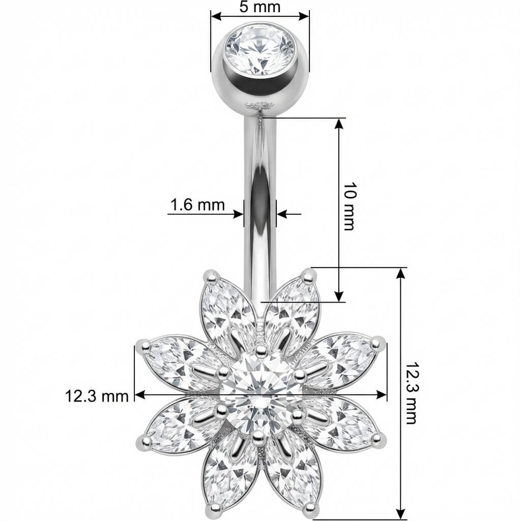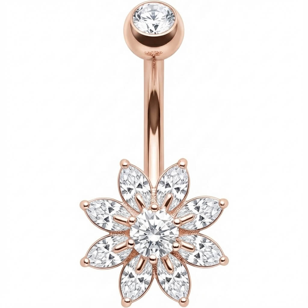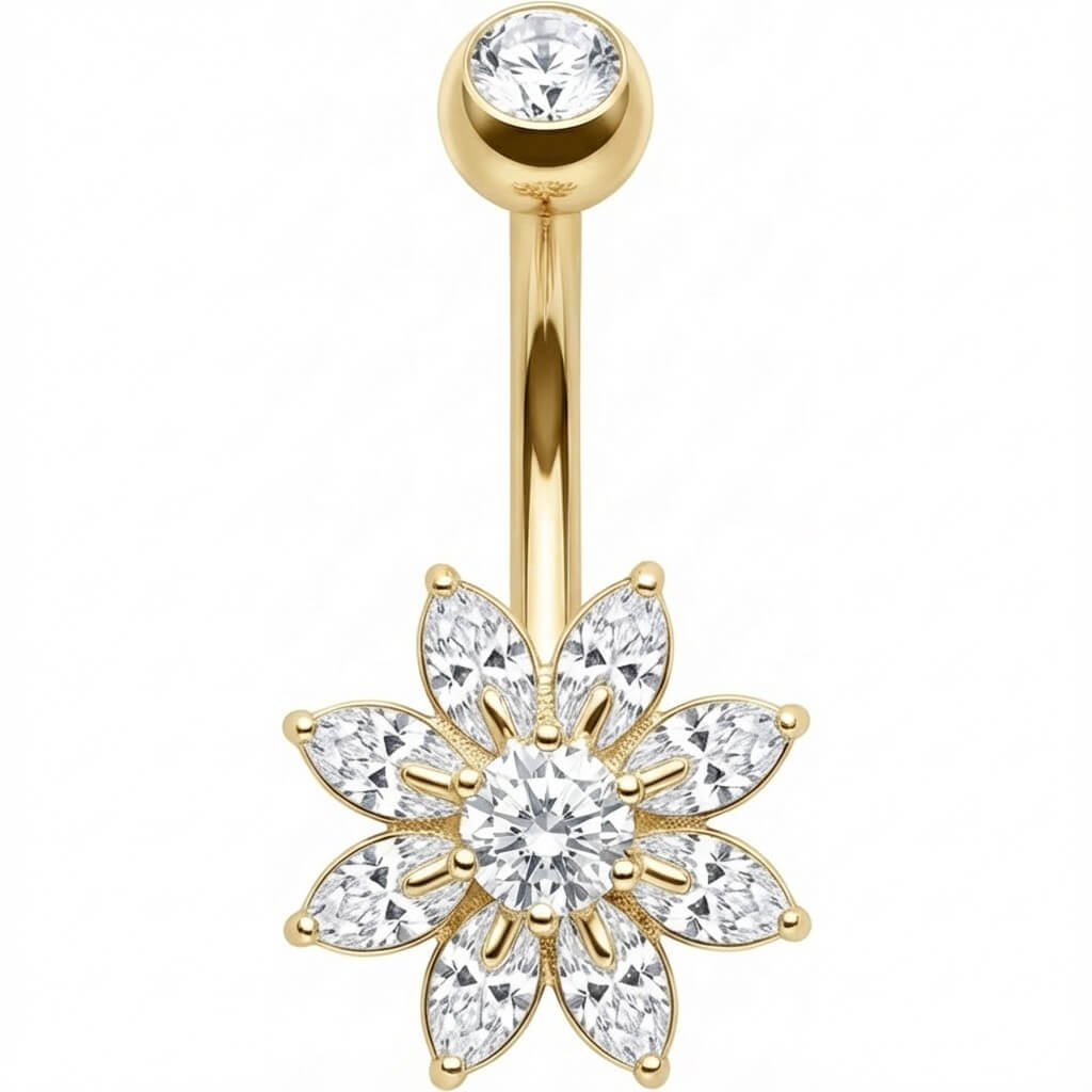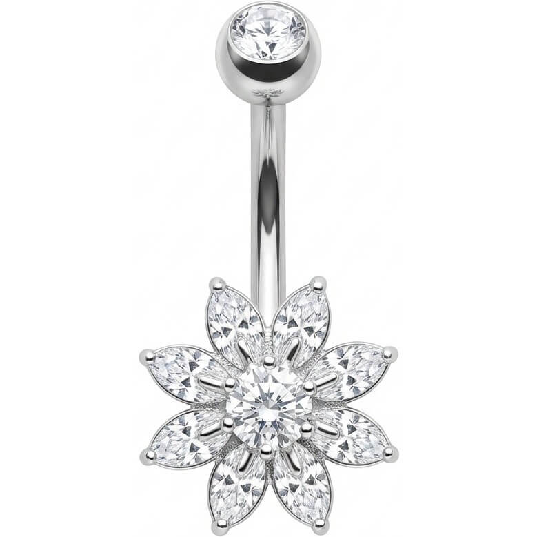 Prête à briller ? Cette sublime fleur en cristaux marquise est l'accessoire sexy qu'il te faut pour l'été. Fabriqué en acier chirurgical 316L de haute qualité, ce bijou capte la lumière à chaque mouvement. Un véritable accroche-regard pour sublimer ton nombril avec éclat, que ce soit à la plage ou en soirée !