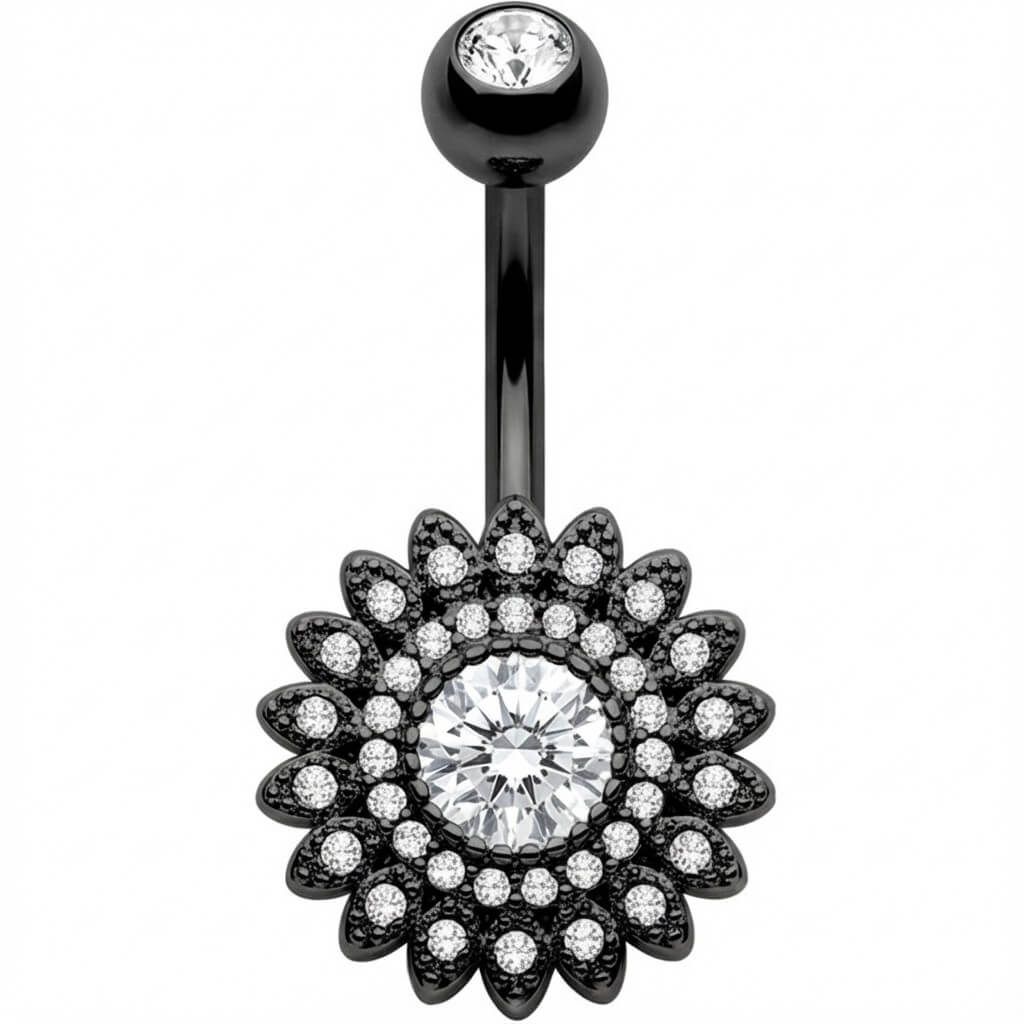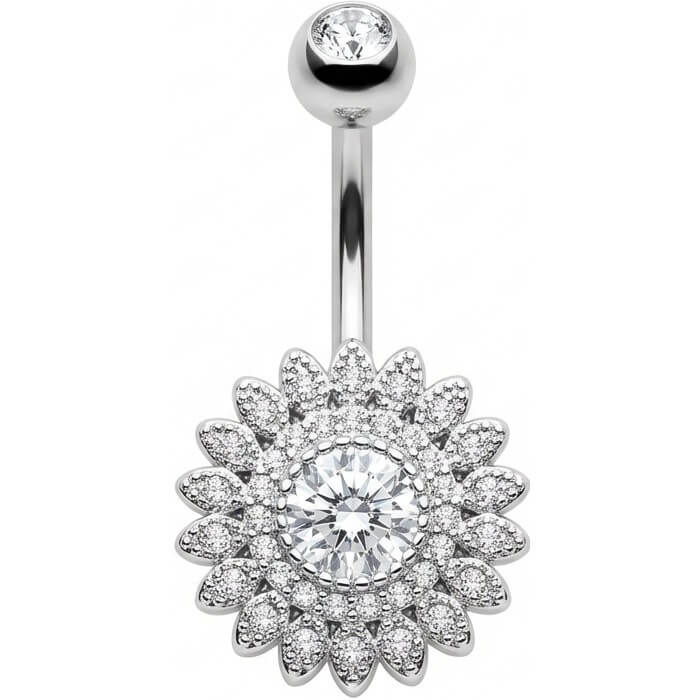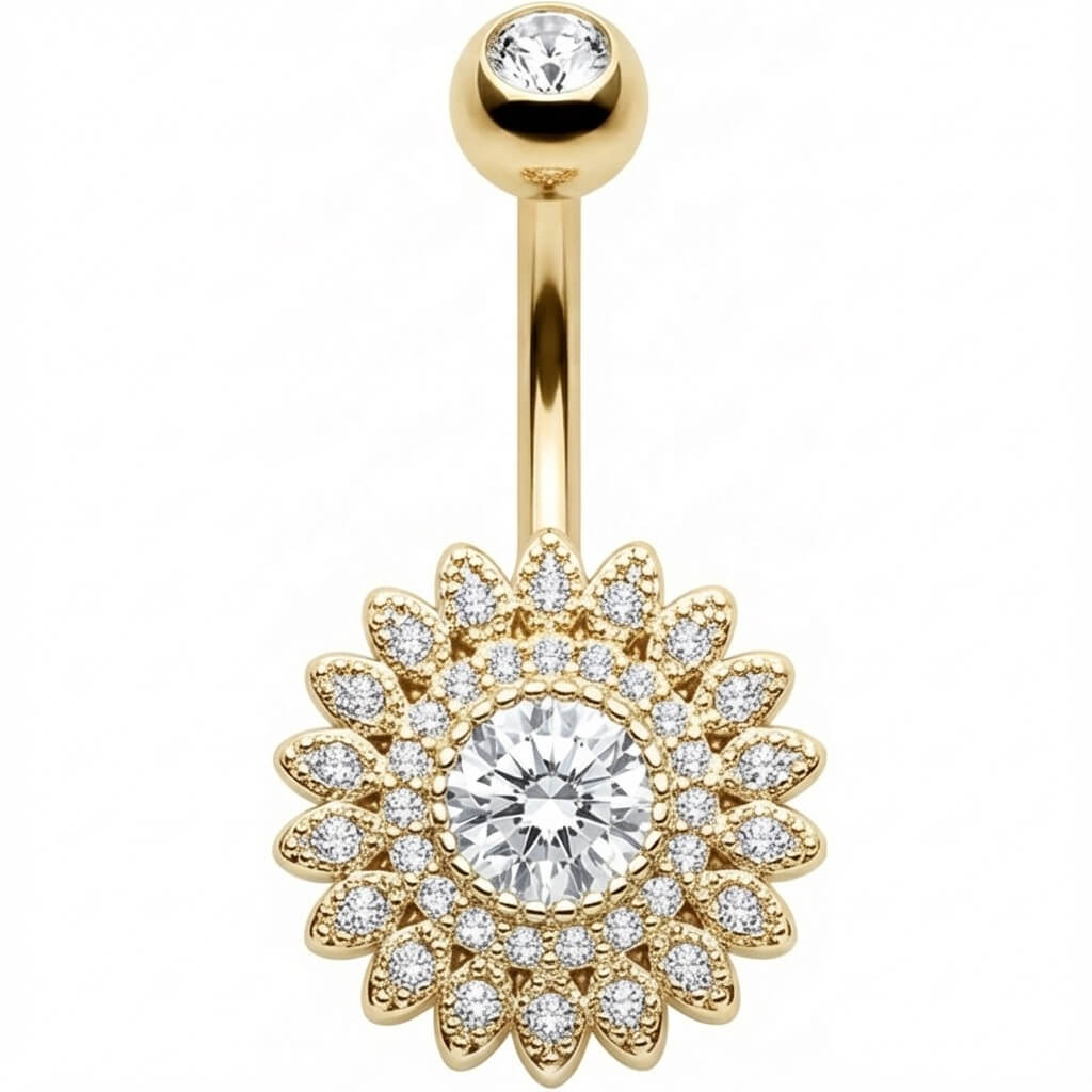 Prête à briller ? Ce bijou sublime arbore un design de tournesol entièrement pavé de cristaux étincelants. C'est l'accessoire incontournable pour un look d'été sexy et un nombril qui ne passe pas inaperçu. Fabriqué en acier chirurgical 316L de haute qualité, il allie style et confort absolu. Parfait pour sublimer ta silhouette à la plage !