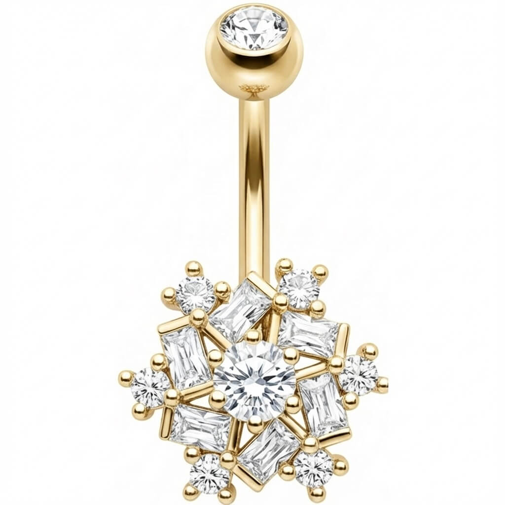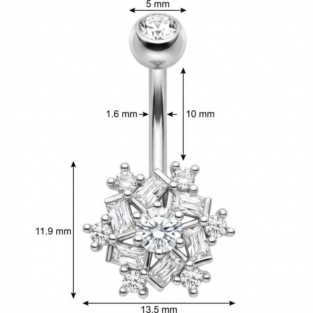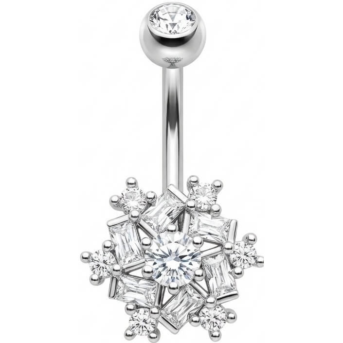 Prête à briller ? Ce bijou est l'accessoire incontournable de ton été. Avec son design en forme de flocon de neige orné de cristaux ronds et baguettes, il capte la lumière à la perfection. Fabriqué en Acier Chirurgical 316L de haute qualité, il est à la fois sexy et confortable. Que ce soit à la plage ou en soirée, cet accroche-regard sublimera ton nombril. Craque pour ce look éblouissant dès maintenant !