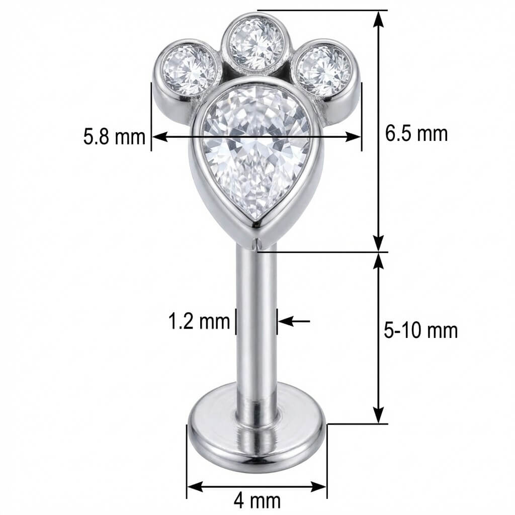 Affiche ton amour pour les animaux avec ce design de patte trop mignon. Il combine un grand cristal en forme de poire et trois petites pierres rondes pour un éclat maximal. Fabriqué en titane de haute qualité, il est hypoallergénique et résistant à l'eau. La touche brillante parfaite pour sublimer ta composition d'oreilles !