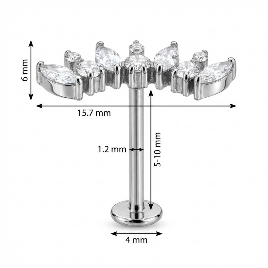Sublime ton oreille avec cette magnifique courbe ornée de pierres étincelantes. Le mélange de formes rondes et marquises épouse parfaitement les contours de ton cartilage. Fabriqué en titane de qualité supérieure, ce bijou est aussi sûr que stylé. L'accessoire idéal pour faire briller ton look au quotidien !
