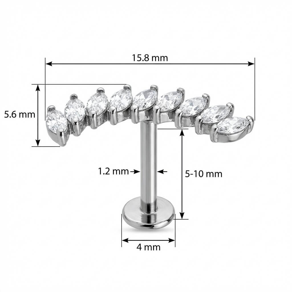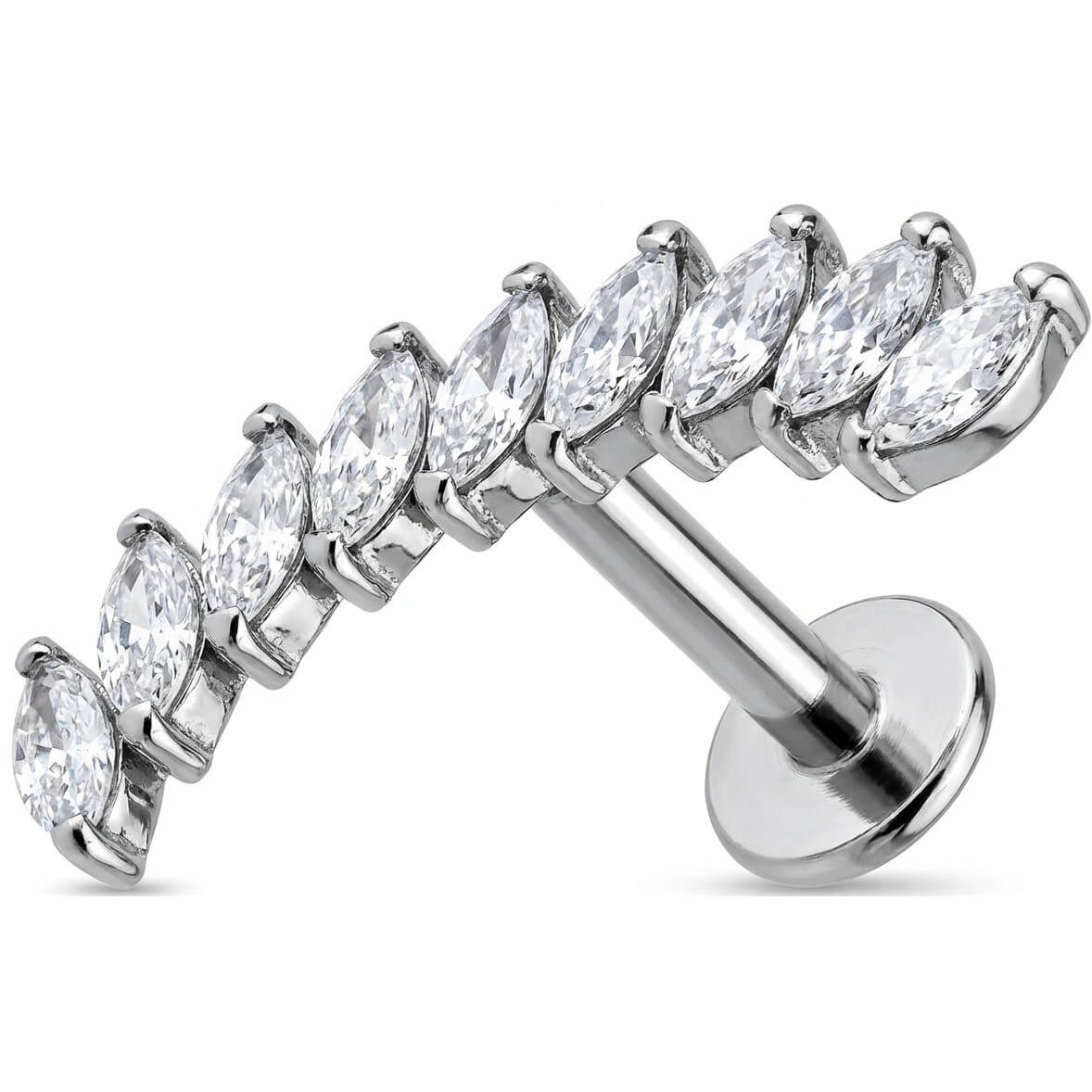 Envie de briller de mille feux ? Ce bijou sublime ton oreille avec une rangée de cristaux taille marquise disposés en une courbe élégante. Idéal pour le cartilage, il épouse parfaitement tes formes naturelles. Fabriqué en Titane de qualité supérieure, il est aussi doux pour ta peau que stylé. La touche finale parfaite pour ta composition d'oreilles.