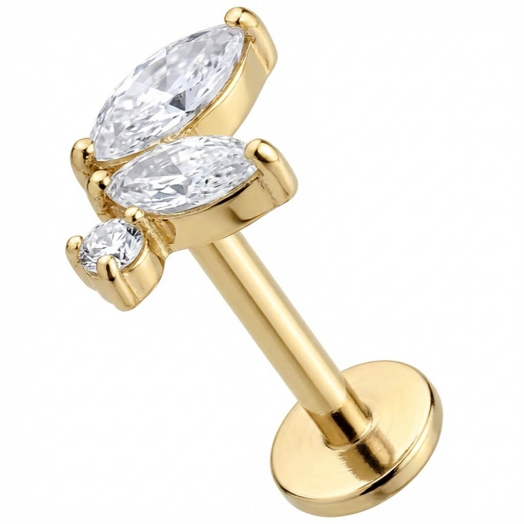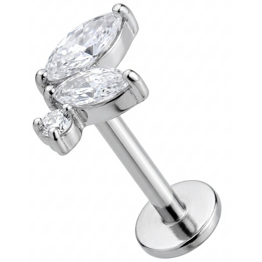 Sublime ton style avec ce magnifique cluster scintillant. Avec ses deux cristaux taille marquise et son petit accent rond, ce motif végétal capte la lumière à la perfection. Fabriqué en Titane de haute qualité, il est hypoallergénique et idéal pour une tenue quotidienne. Le bijou parfait pour upgrader ton hélix ou ton tragus !