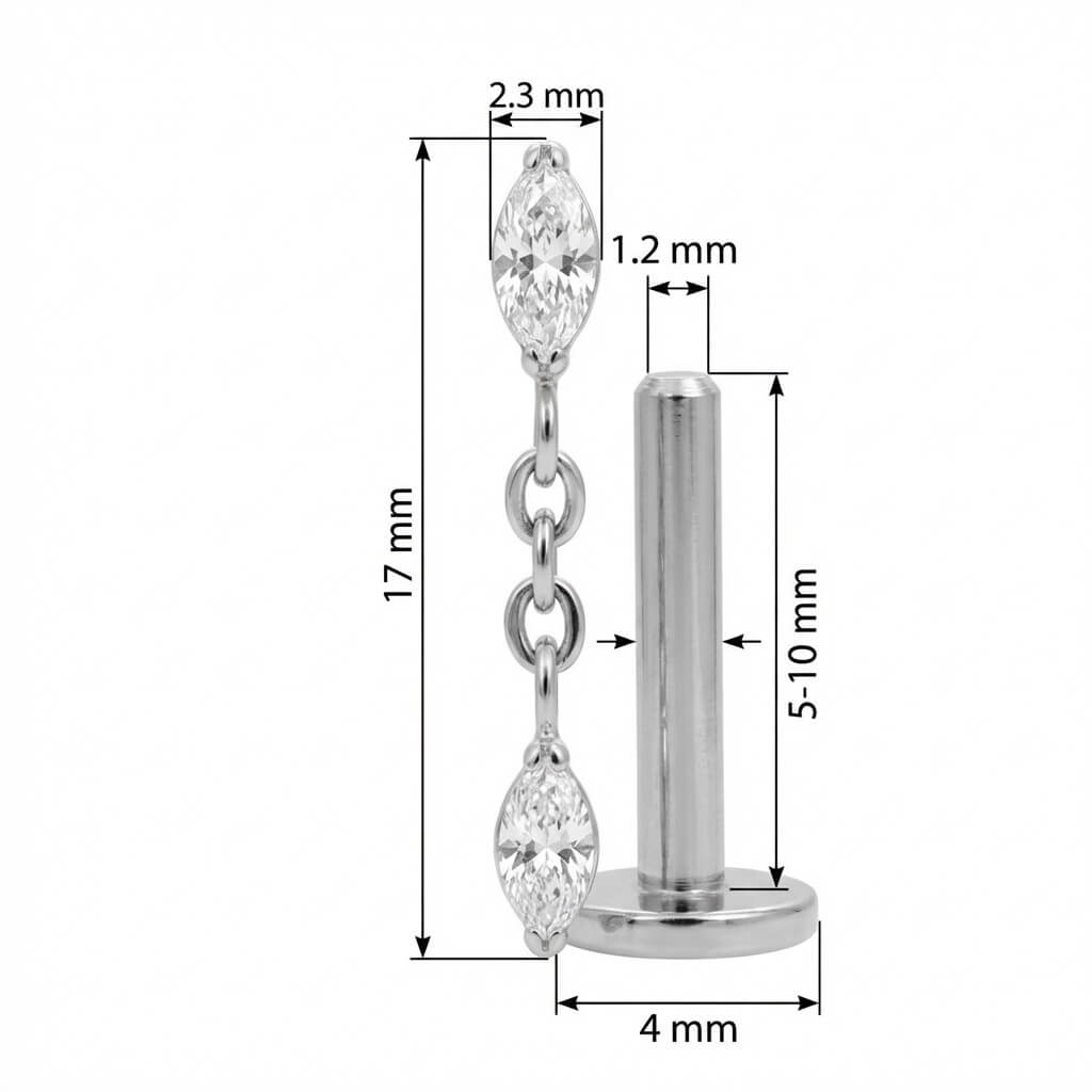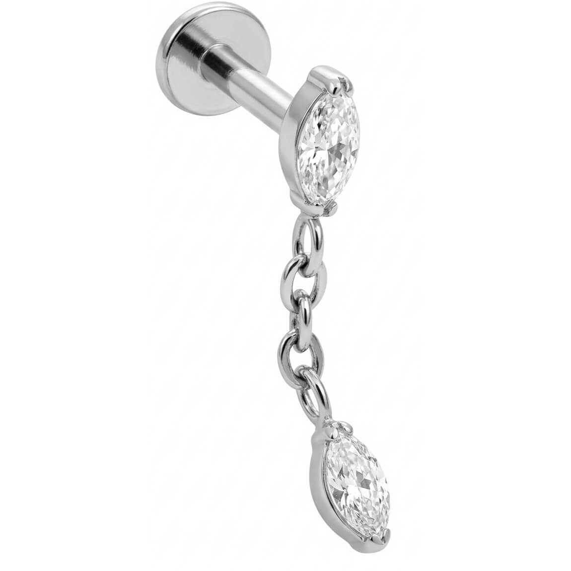 Ajoute une touche d'éclat et de mouvement à ta compo d'oreille. Ce bijou présente un cristal taille marquise relié à un second par une fine chaînette pendante pour un effet waouh. Fabriqué en Titane de haute qualité, il est hypoallergénique et résistant à l'eau. Idéal pour sublimer ton hélix ou ton lobe avec style.